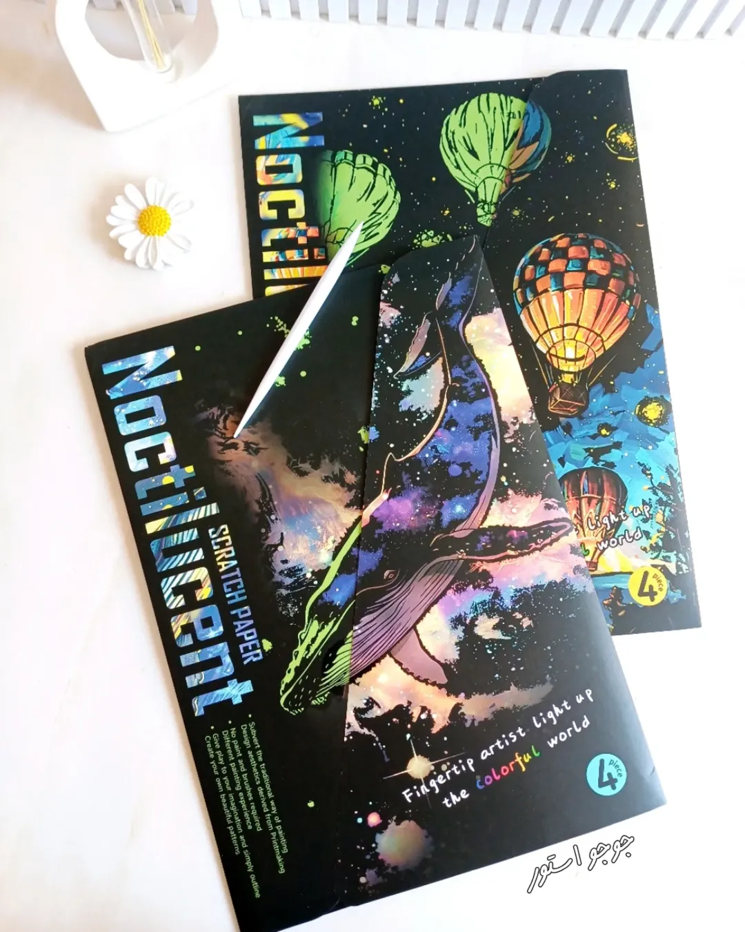 اسکراچ آرت یا اسکرچ بوم نقاشی خراشیدنی بزرگسال همراه با قلم دوسر ، اسکرچ برد سایز بزرگ مدل نهنگ وال و بالون سایز A4 ست ۴ عددی