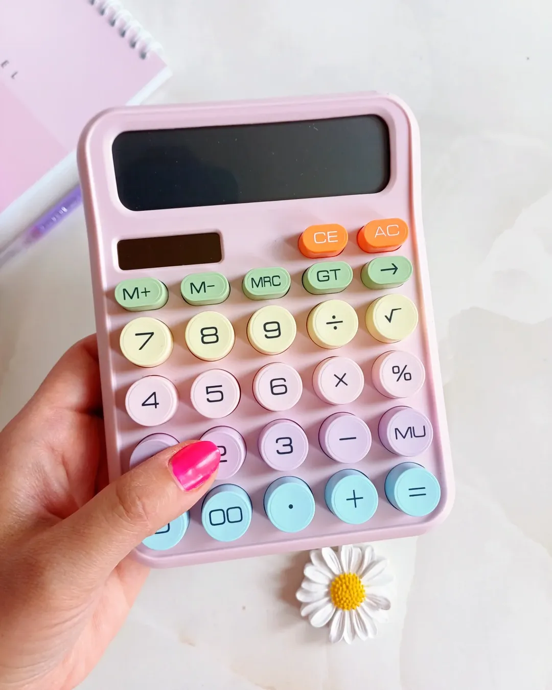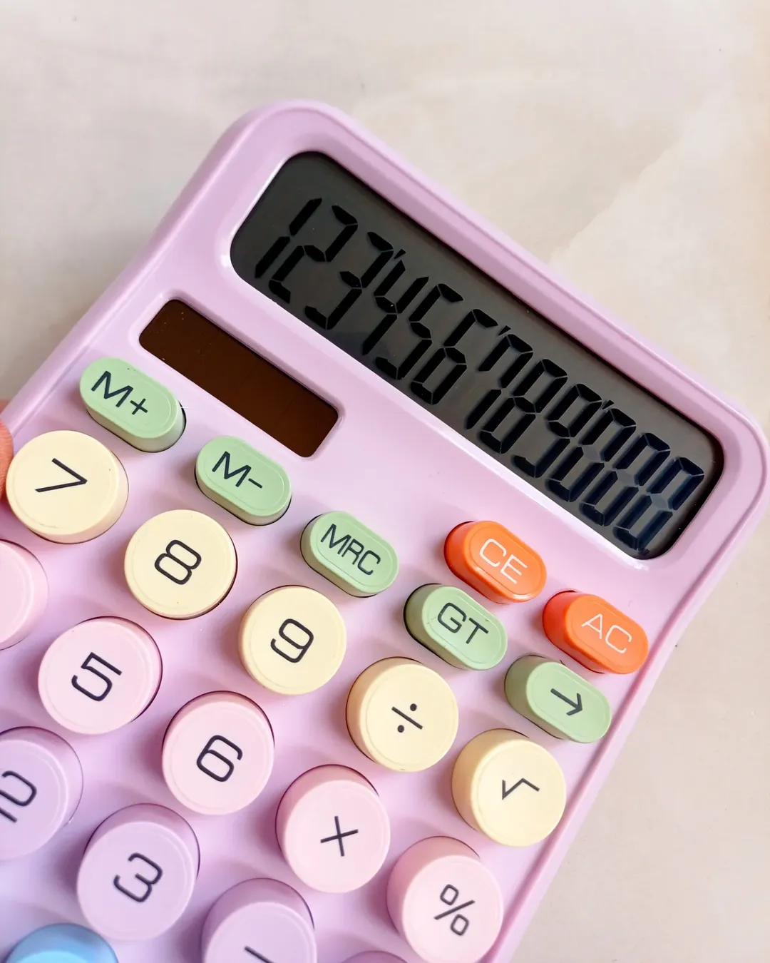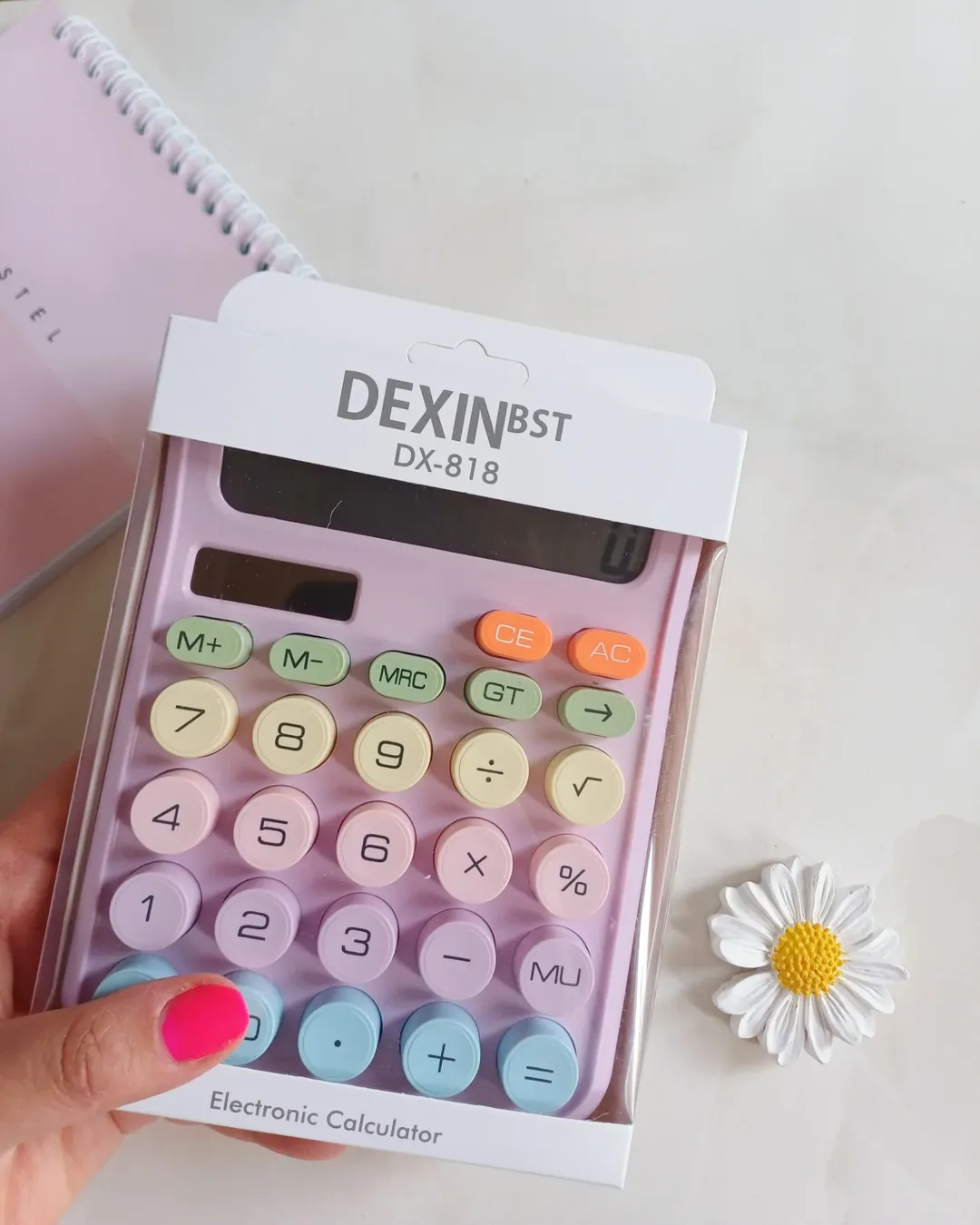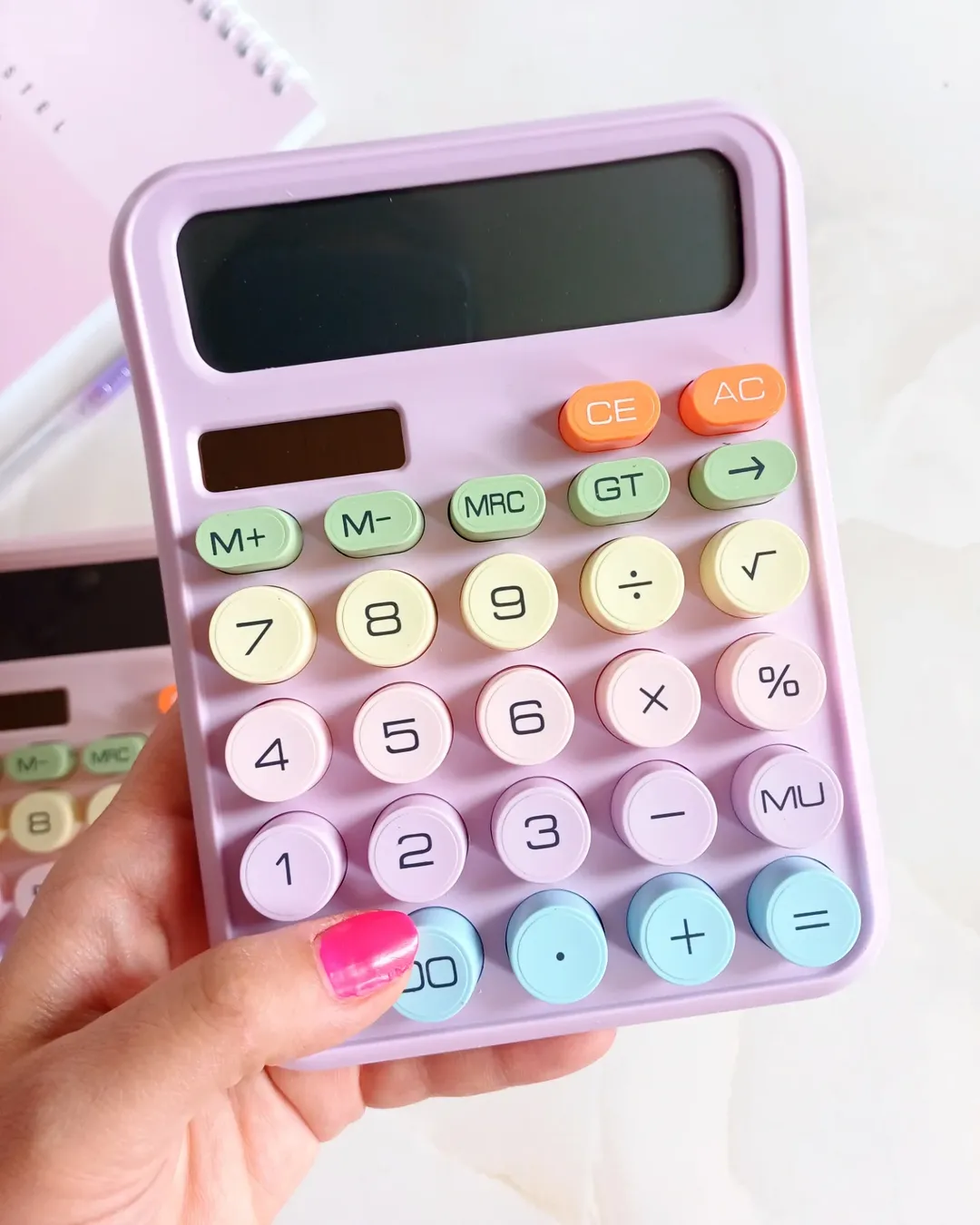 این ماشین حساب ملیح و ناز پر از رنگهای پاستلی است. نمایشگر بزرگ و ۱۲ رقمی با دکمههای بزرگ