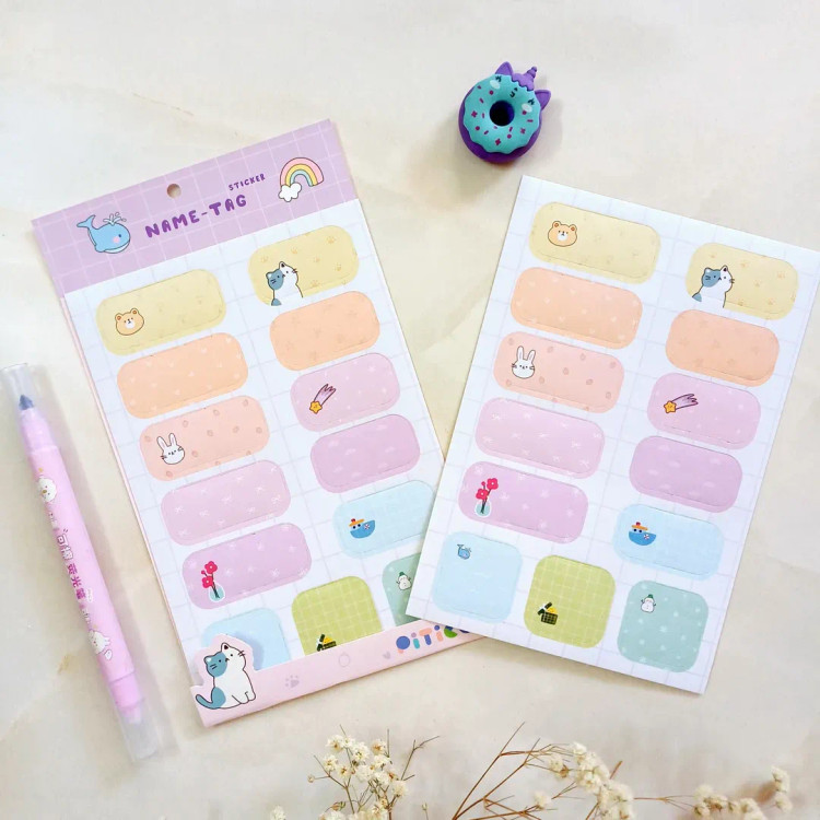 طرح ها و رنگهاش به قدری خاص و زیبا هستند که دلت میخواد همشون رو بخری هر پک 2 ورق برچسب اسم داره در مجموع ۲۴ عدد برچسب میشه واسه کتاب ها و دفترها و لوازم تحریر عالین